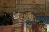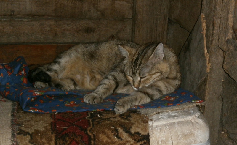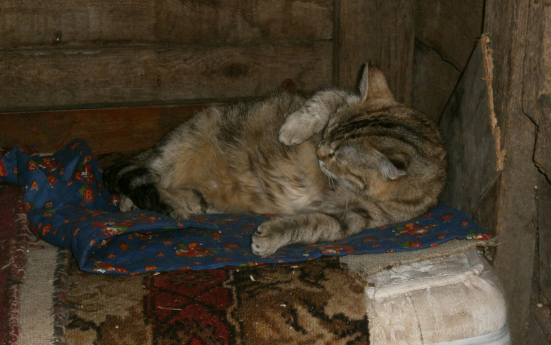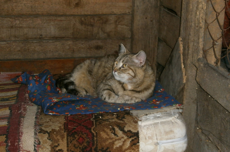 Оказалось, кошку зовут Настя, ей 3 года. У нее интересная расцветка, как бы обычная серо-полосатая, но с какими-то рыжеватыми пятнышками.