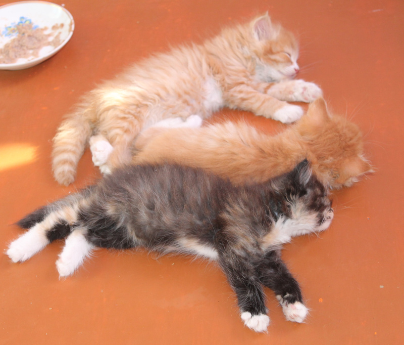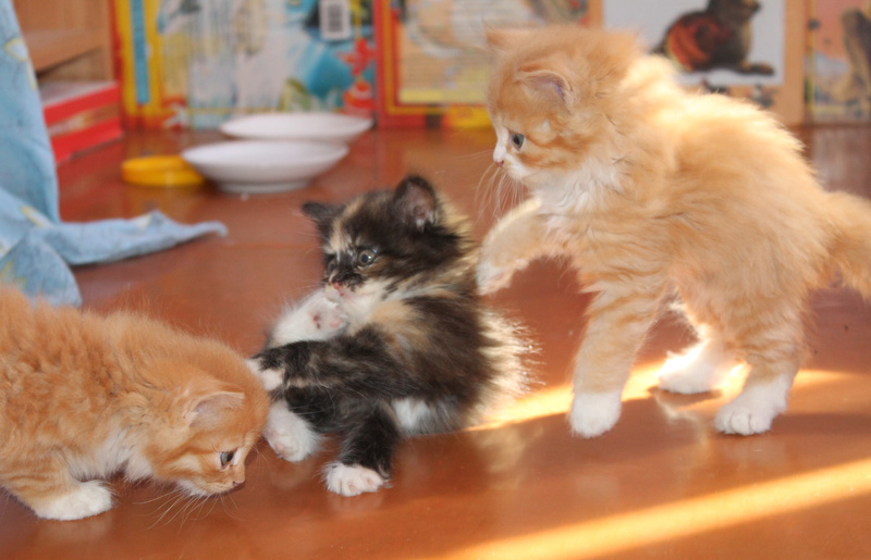 Замечательные котятки два рыжих мальчишки и разноцветная девчушка ищут своих хозяев.