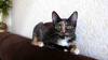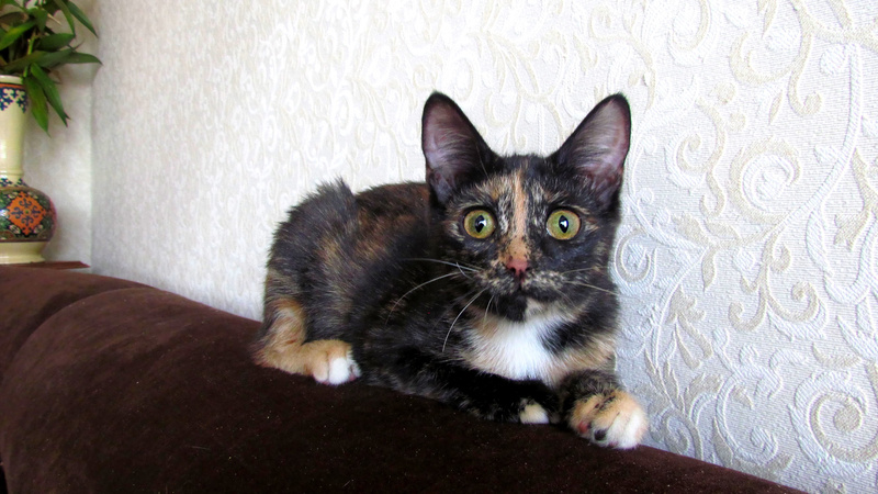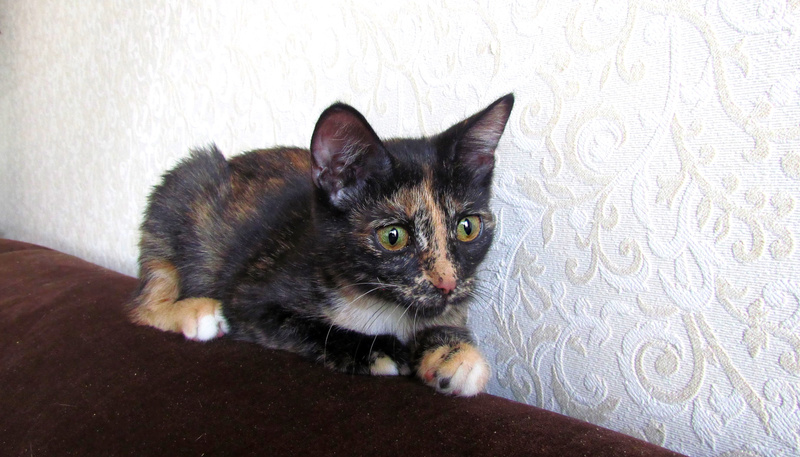 Трёхцветная гладкошерстная котёнок - девочка, 5 месяцев. Спокойная, ласковая, обожающая человека. К лотку приучена. Стерилизована. Очень милая и обаятельная девчушка с веснушками.