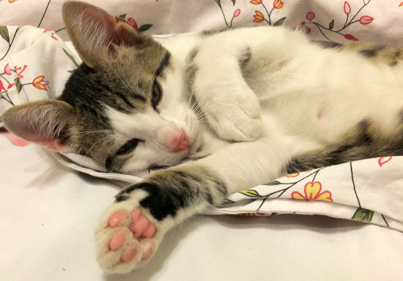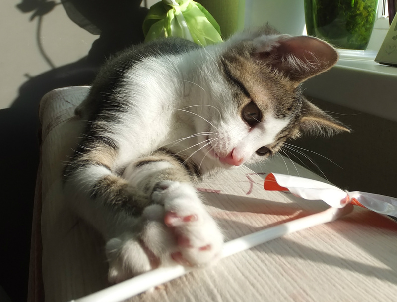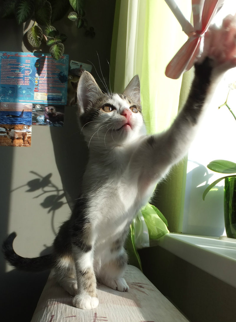 Матросику около трёх месяцев. Нашли его на детской площадке. Очень бодрый, всем интересующийся котёнок. Любит спать на коленочках, ловить зайчиков (лазерных) и вкусно кушать. Сейчас ест сухой корм вместе с моим котом, но согласен скушать всё, что можно разгрызть
