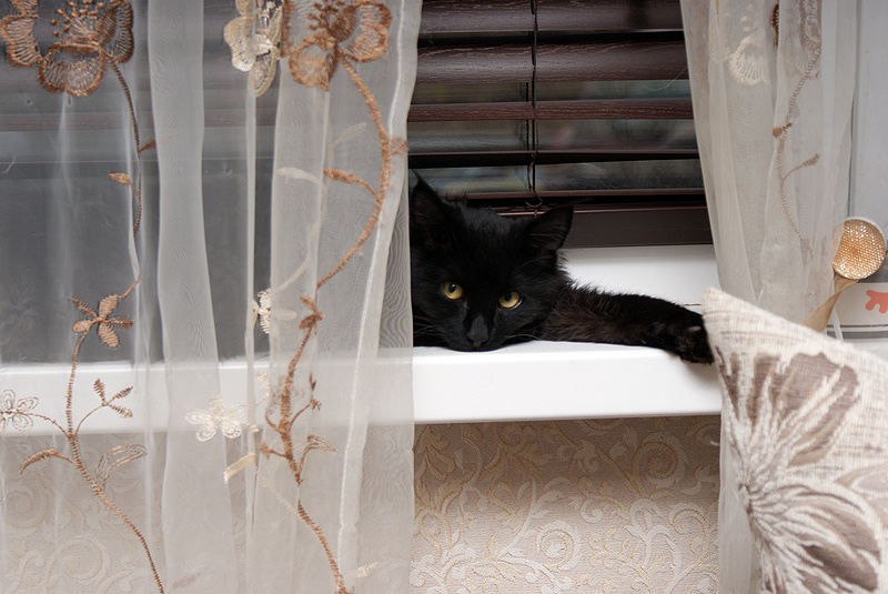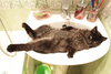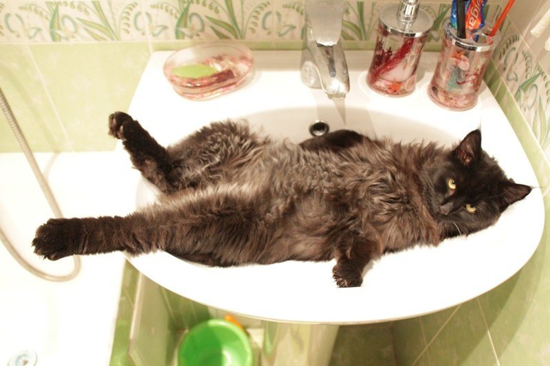 Облюбовал себе "кабинет" -ванную комнату с персональной лежанкой -раковиной). Как наведет порядок в квартире, то идет отдыхать )))).