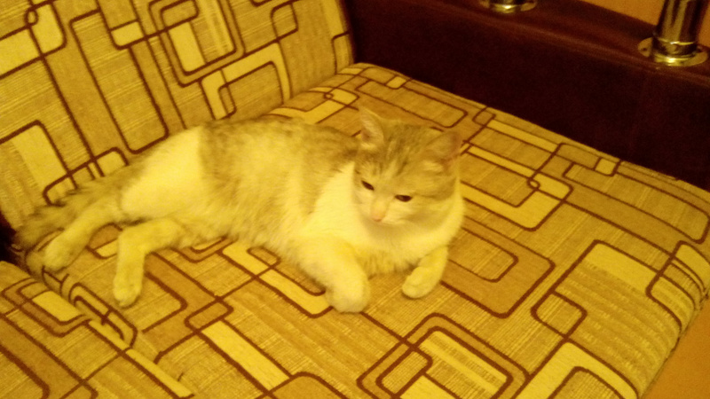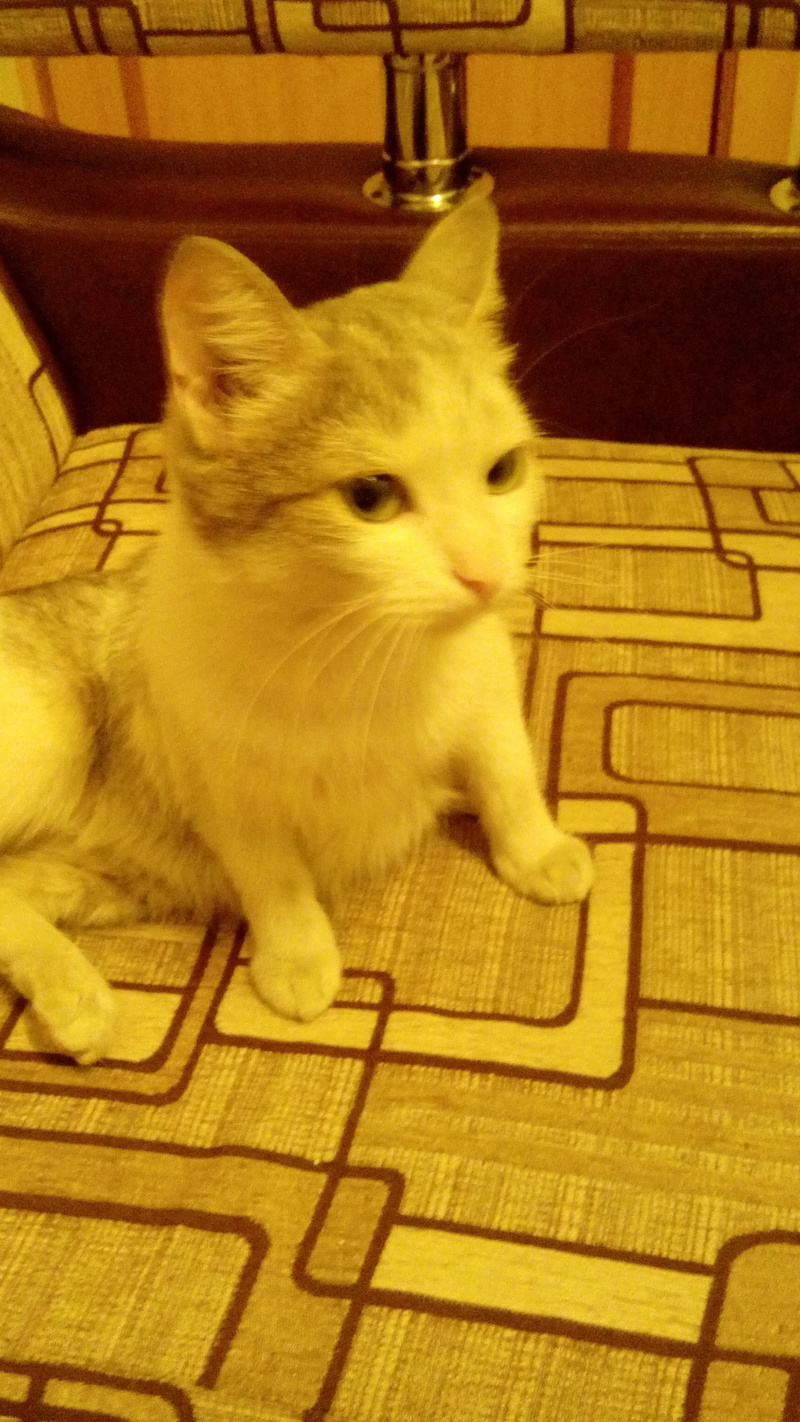 Тянется к людям, очень ласковая, к другим животным агрессивна, видимо ее немного подрали (на щеке ранка).