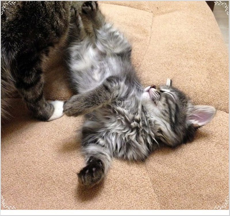 Шурке уже 2 месяца. Киса пушистая, игривая, самостоятельная. Играет с мамой, со своим хвостом и любыми игрушками. Дружит с лотком. Кормим Royal Canin для котят. Проглистогонили.