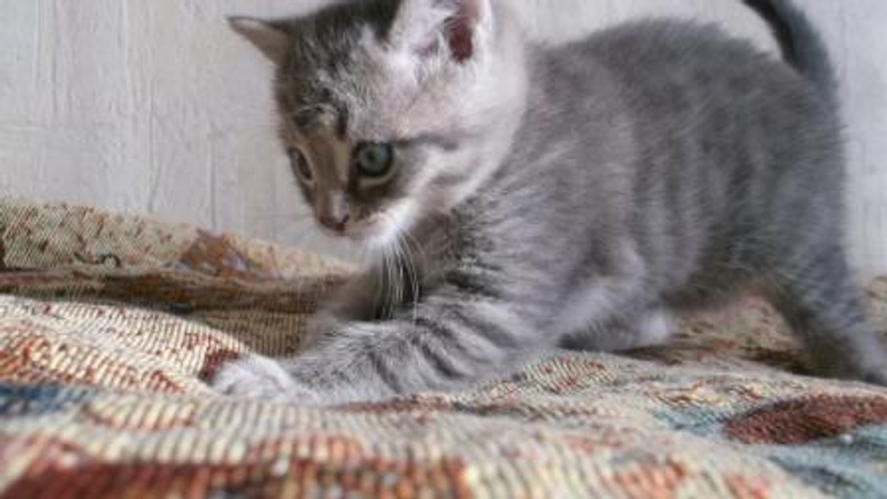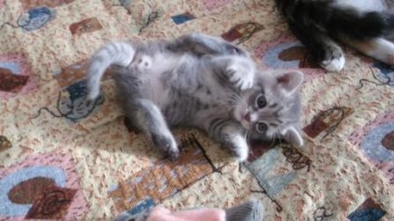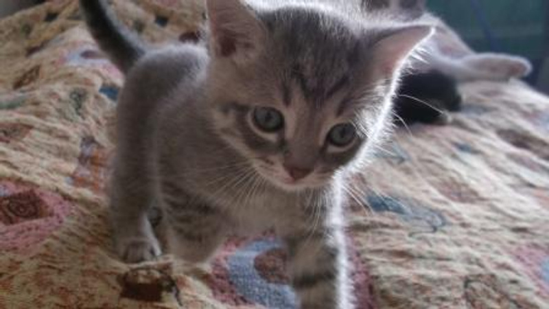 Дымок - мягкий, дымчато-серый в полосочку малыш с рисунком "кошачьи ушки" на лбу. Подушечки лапок и носик - шоколадного цвета. Спокойный, неконфликтный ребёнок. Родился 27 ноября. Кушает сухой и влажный корм для котят, не отказывается от молока.