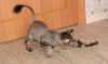Сразу пошёл в лоток, кушает сухой корм.