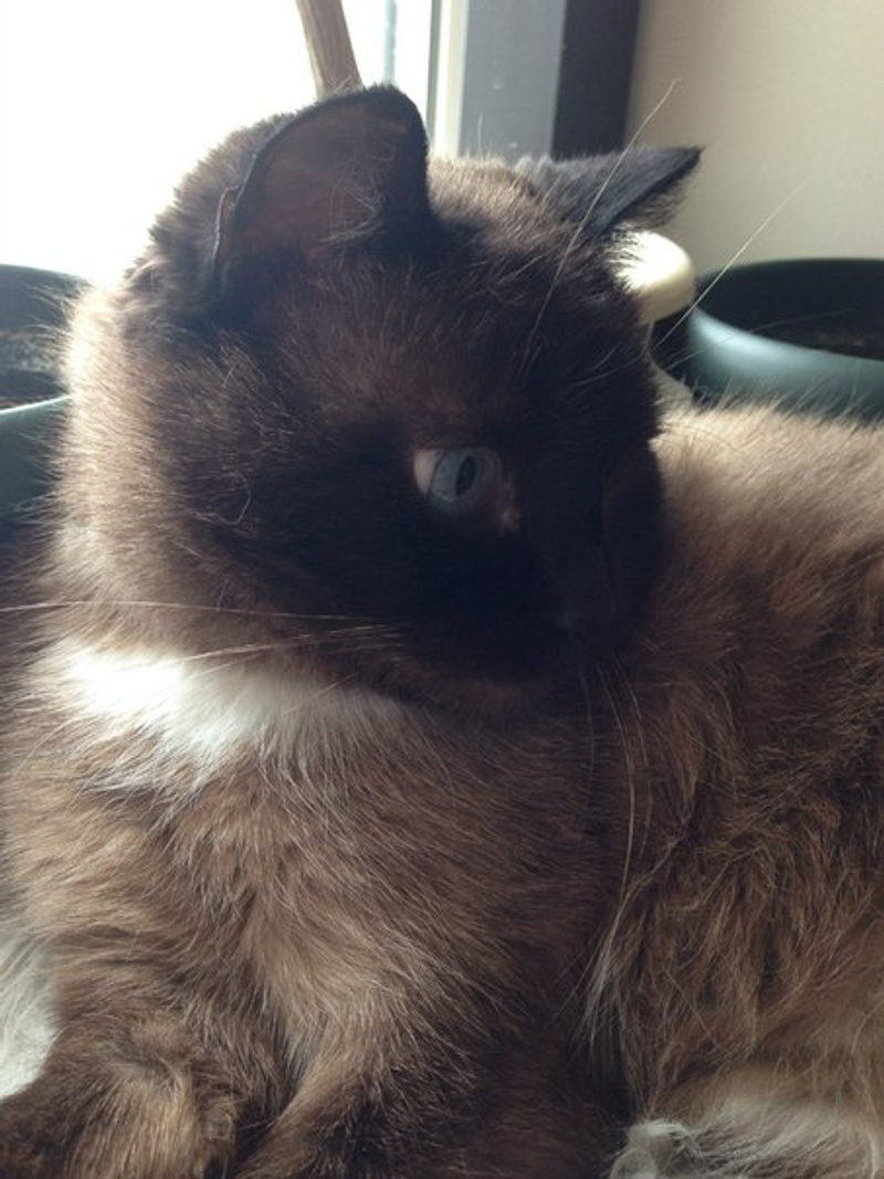 К сожалению, Барсе многое пришлось пережить, в том числе тяжелую травму глаза. Его удалось сохранить, но зрение восстановить на этом глазу невозможно. Однако несмотря ни на что Барса остается доверчивой кошкой, очень любит человека и исполняет ласкательно-мурчательные обязанности в самом лучшем виде.