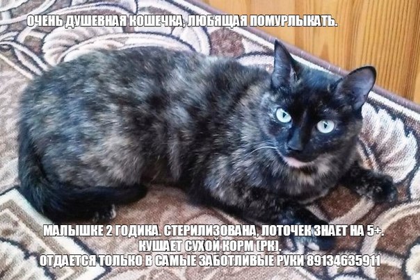 Малышке 2 года. Ласковая, не навязчивая. Стерилизована, профилактически обработана от паразитов, лоточек знает на отлично. Кушает сухой корм(РК). Отдается только в самые заботливые руки и с возможностью интересоваться дальнейшей судьбой.