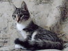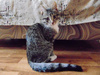 Очень красивый, фото в полной мере не отражает. Огромные глаза, огромные уши, длинный хвост, очень белое пузо и грудь, четкие черные полоски. Глаза обведены белым, от глаз идут двойные черные полосы, на лбу черная буква "М".