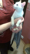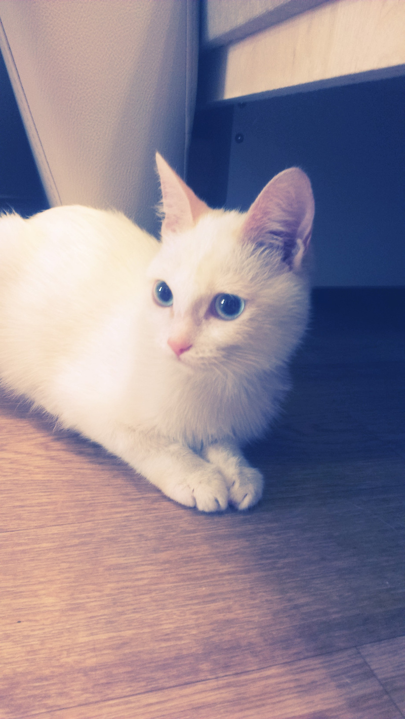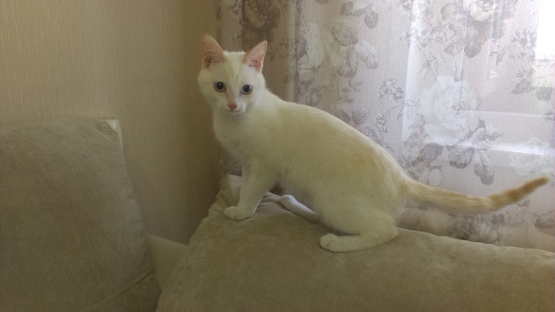 Найдена в подъезде, по всем признакам - бывшая домашняя. Оставить у себя нет возможности...(( Возраст на вид месяцев 6-8,подросток. Окрас белый, с полосатым рыже-белым хвостиком и большими Голубыми глазами=)