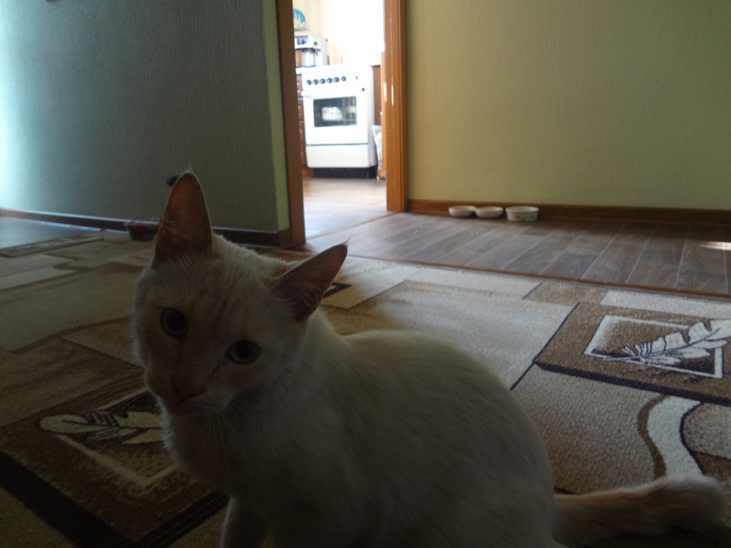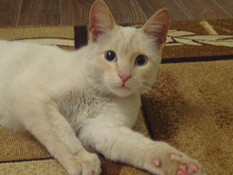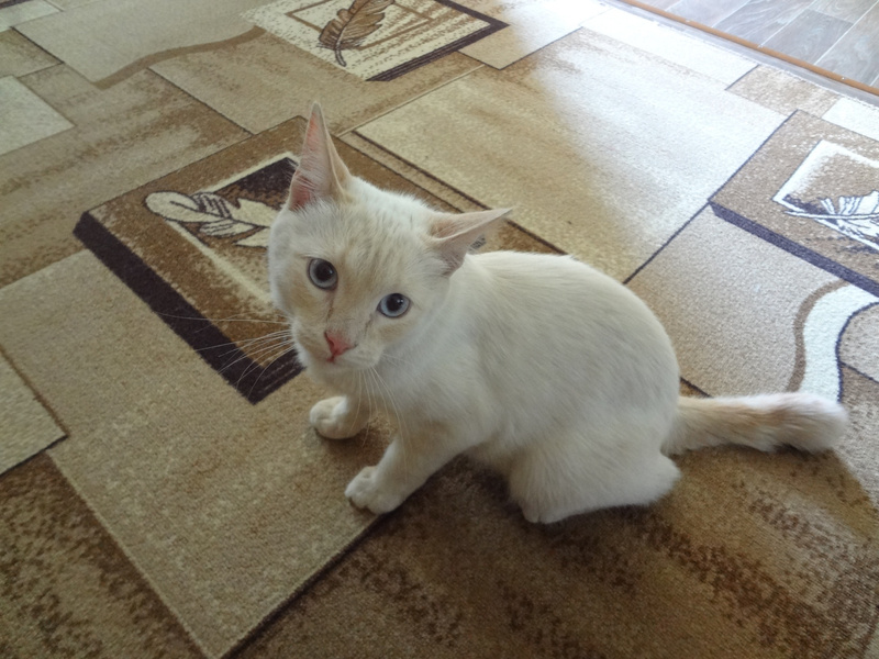 В роду у нас скорее всего были тайские кошки, поэтому у нас очень красивый окрас, ред поинт (белый с рыжим) и очаровательная мордашка.
