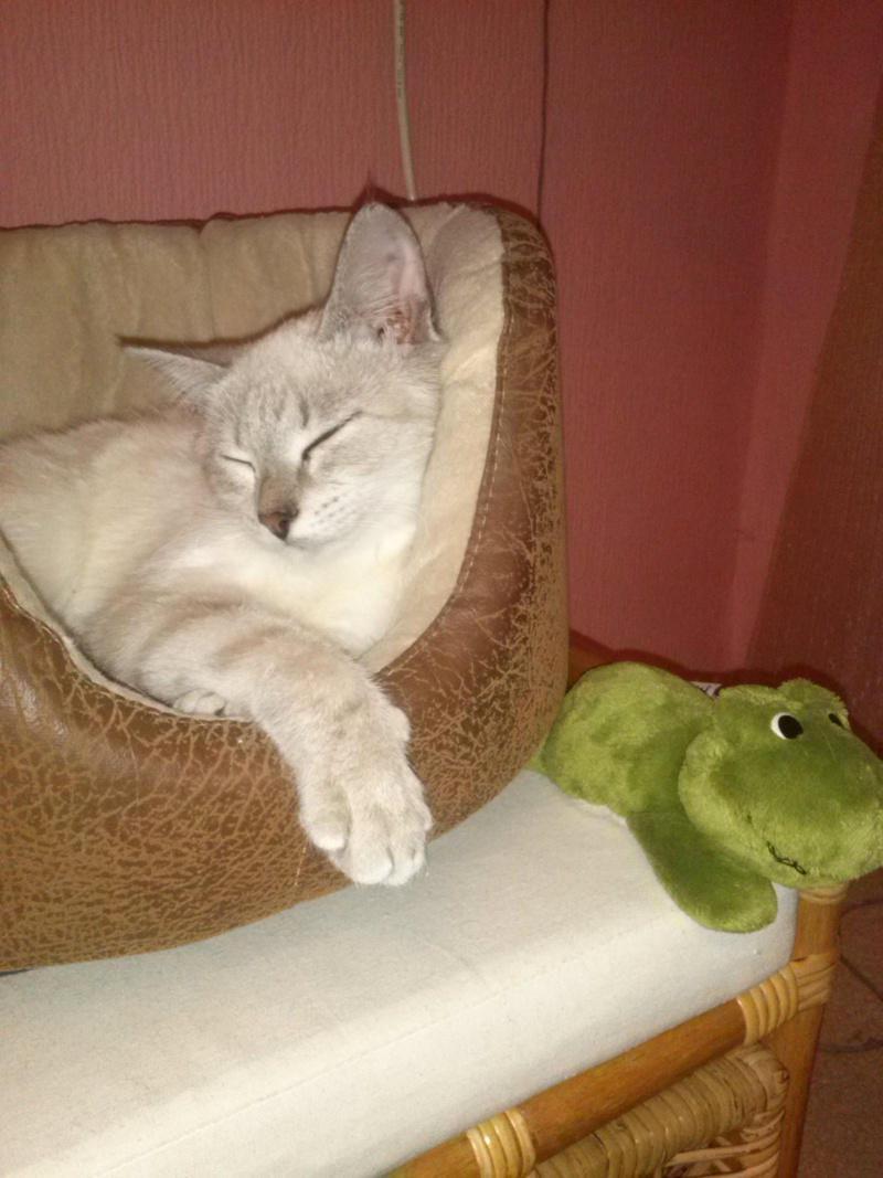 Вчера привезла с дачи кошечку тайского окраса, прибилась и жалко было не взять , т.к очень ласковая ) мурчит как "трактор", но у меня уже есть кот и он очень сильно психологически её не воспринимает:((