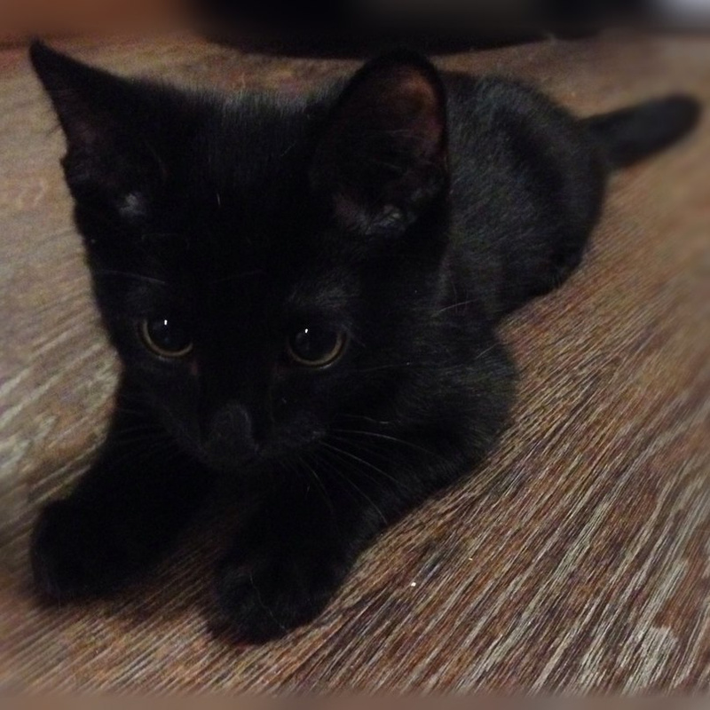 Черный мальчик, ок. 3,5- 4 месяцев. Отличный котик – игривый, хулиганистый, сообразительный и общительный. Мурчит громко. Имеет интересный окрас: на общем черном фоне – шоколадные бока, на которых видны пятна более темного цвета, на грудке и на животе есть белое пятнышко. Здоров, лоток отлично.