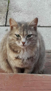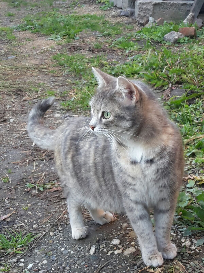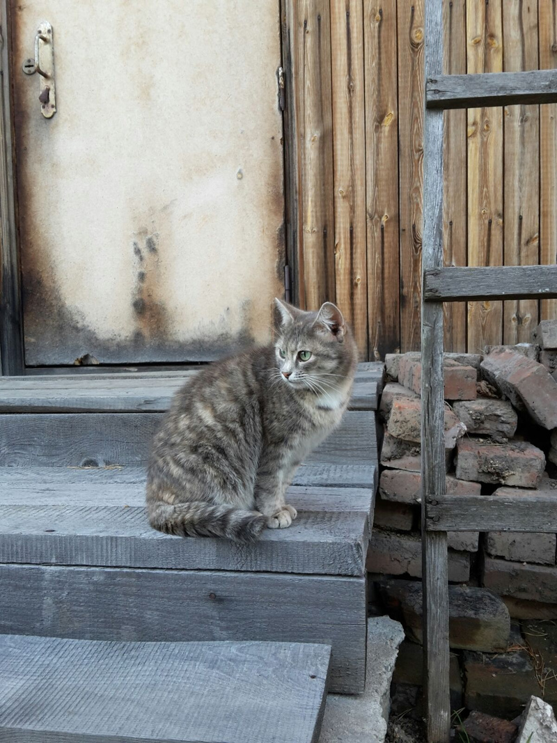 К соседке на даче прибилась кошка, видимо кто-то выбросил на улицу. Серенькая, очень красивая - воспитанная, в дом не заходит - ночует на крылечке. Сейчас она окотилась, 2 котенка умерли - замерзли, третий живой - серенький, ему около 1 месяца. Такой же красивый, как мама