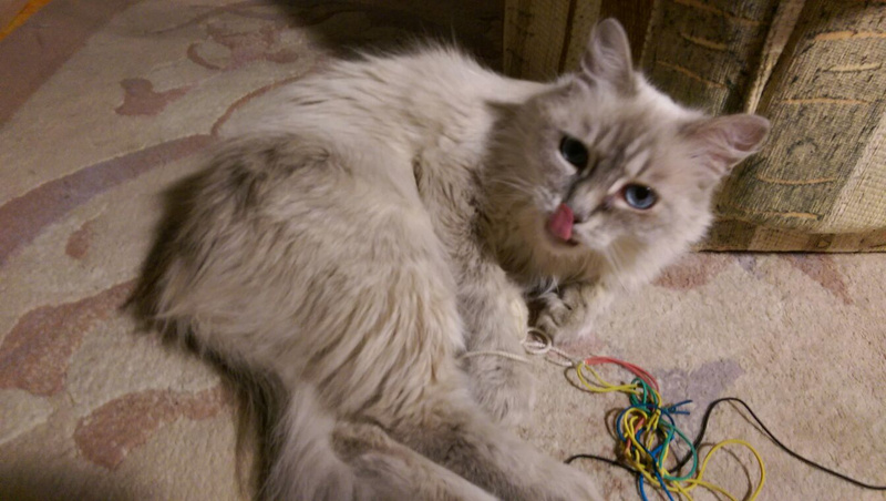 Очень любит поиграть. Гоняет мячики, клубки, таскается с мышками из комнаты в комнату, прыгает с удочкой, громыхает треком (особенно весело ночью). С удовольствием идет на руки ко всем приходящим в нашу квартиру - ей любая ласка за счастье.