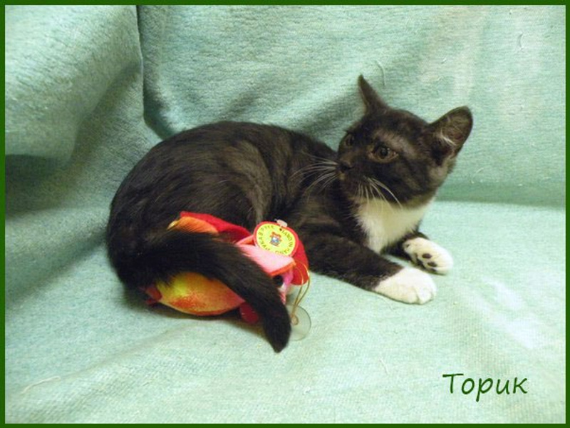 Красивый маленький котенок Торик обладает, на первый взгляд, классическим черно-белым окрасом с белой манишкой, перчаточками и носочками, но шерстка у него дымчатая, очень приметная и красивая. Этот нежный стеснительный малыш с одной стороны тянется к людям, с другой - слегка опасается, ему нужен чуткий и ласковый хозяин, который растопит напуганное сердечко Тора и подарит ему любовь.