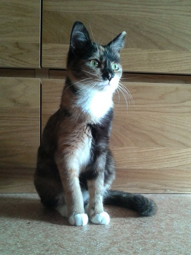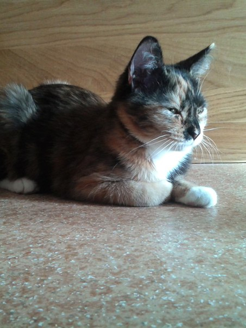 Стинки 8 месяцев, у нее необычный черепаховый окрас – крупные пятна и белые носочки на всех лапках, большие желтые с зеленоватым отливом глаза и дополнению ко всему - пятнистый смешной носик. У малышки довольно чувствительное пищеварение, реагирует на смену корма, кушает сейчас самый подходящий для неё корм royal canin sensible. Как и любой ребёнок - любопытная и игривая, обожает бегать за мячиками и прыгать за бантиком на ленточке. Всегда рада прилечь к вам под бочок и промурчать песенку, очень общительная и много разговаривает, для поглаживаний подставляет свое пушистое пузико.