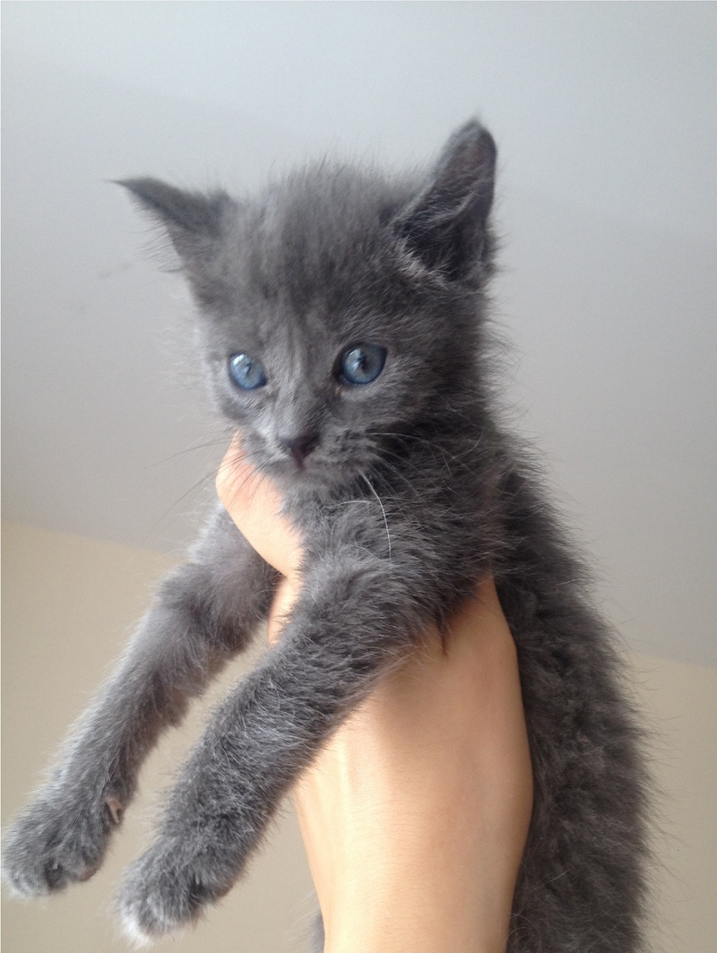 Найден котенок возле подъезда. Маленькая серенькая девочка с синими глазками. Очень энергичная и игривая. Сама я живу в общежитии и не могу оставить, разрешили 1-2 дня подержать, пока не найдутся добрые люди.