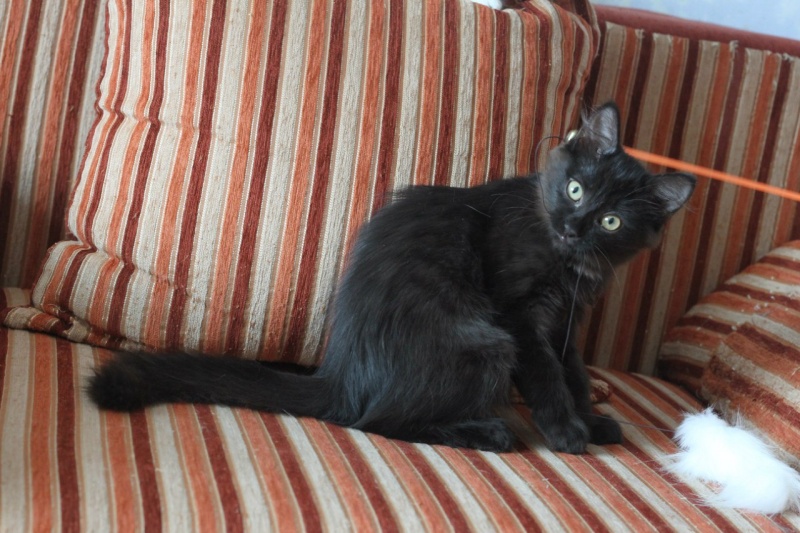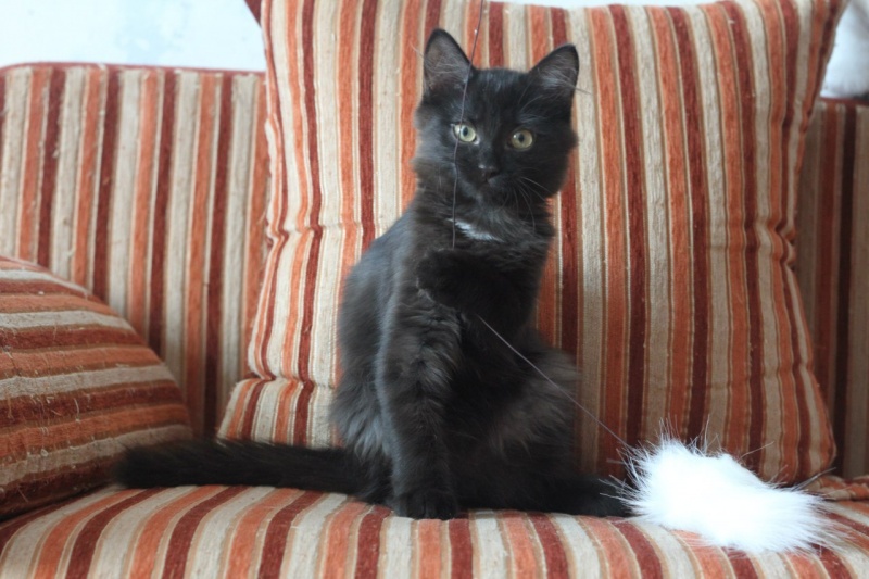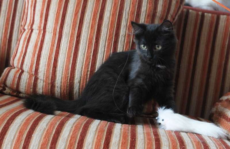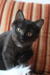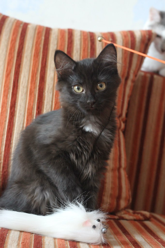 Элегантная малышка одета в маленькое черное платье с белым кулончиком на шее, имеет бойкий характер, очень умненькая и сообразительная. Девочке сейчас примерно 2,5-3 мес., проглистогонена, без промахов ходит в лоточек с наполнителем. Вырастет в невероятно красивую кошку.