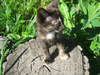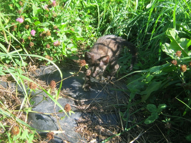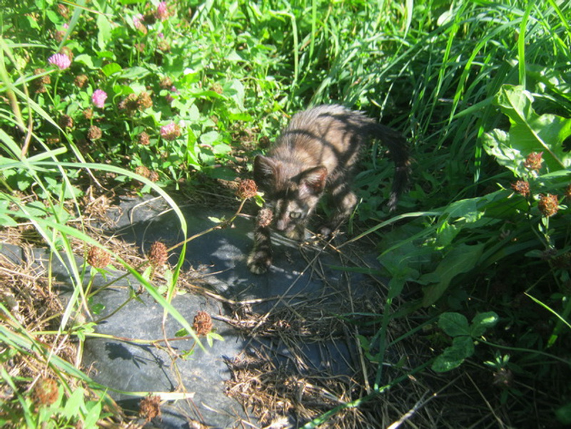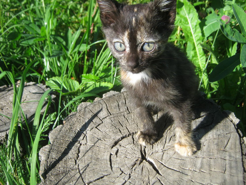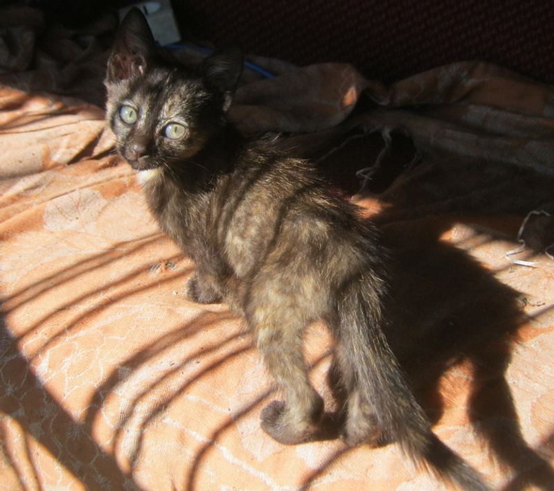 Здравствуйте! Нашли котенка, а вернее бедолажка сама нас нашла - выбежала из кустов, возле трассы, отчаянно мяукая. Худющая, несчастная..Быстро схватили, вернулись домой..Брать было некуда - с дачи съезжаем, своих кошек, собак куча. На время придумали выпустить к кошачьему семейству в наши подвалы, хотя бы на время. Но дома передумали - так настрадался котейка, такой вид несчастный..Бегает хвостиком, смотрит в глаза - ну такой благодарный! Выручила Надя, как всегда - взяла на дачу, на месяц, потом съезжает. Котенок счастлив - освоился почти, с котосемейством отношения сложные, кошки строжатся. Сколько натерпелся котенок, и думать страшно. Теперь нужен добрый хозяин малышке (девочка), очень ждем. Звоните - 8-951-381-18-70.