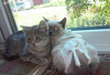 Вот такие малыши ищут хозяев! Возрастом около 4-5 мес, маленькие несчастные и очень дружные ребятки. Мальчонка расцветки агути, серенький в полосочках, на пузике крупные "яблоки". А девочка тайской масти, окраса блю-пойнт. Парень посерьезнее и посмелее, он защищает сестру, мужественно прикрывая ее своим худеньким тельцем от любой опасности. А лапочка-крошка жмется к брату, она еще не привыкла к вниманию людей, осторожничает и боится.