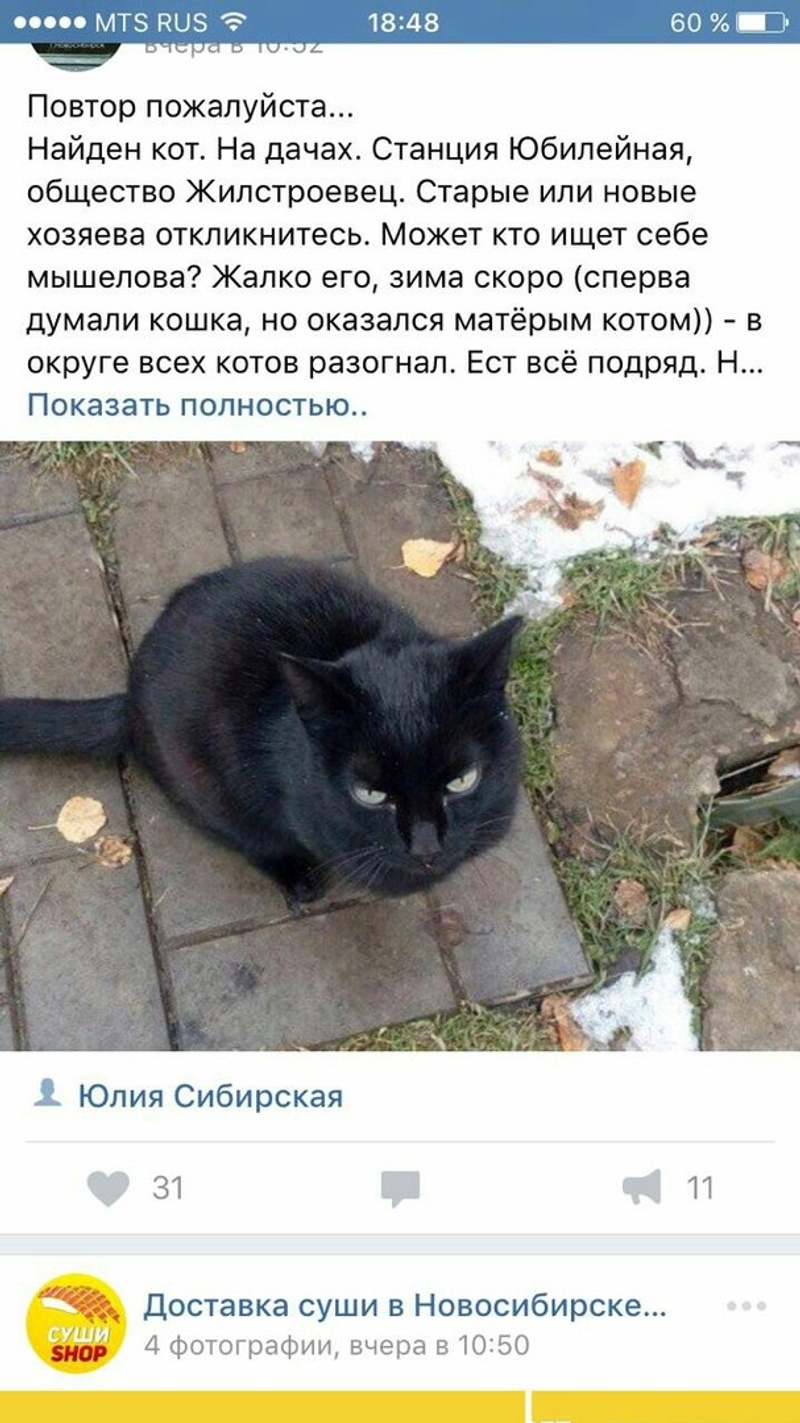 Но недавно в одном из постов мы увидели, что в дачном обществе «Жилстроевец» на станции Юбилейная нашли брошенного кота, который очень похож на прошлогоднего. Сначала мы подумали, что черных котов много и это просто совпадение.