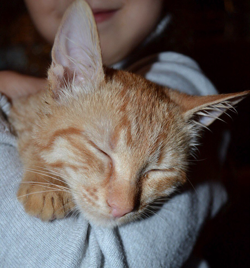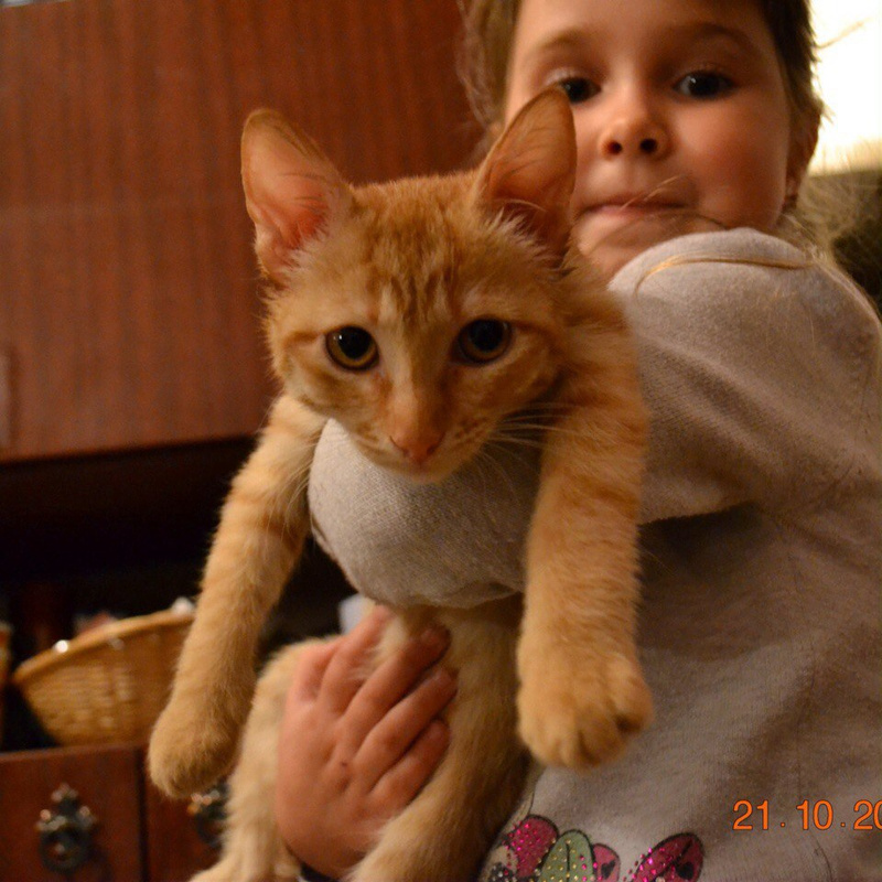 Эта апельсиновая деточка была найдена на улице, сейчас ей приблизительно 2,5-3 месяца. По характеру скорее рассудительная и спокойная. Да, она, как и положено котятам этого возраста, игрива и активна, но при этом знает меру, не хулиганит, не скачет по занавескам, столам и головам. Апельсинка ориентирована на человека – ненавязчива, но с удовольствием посидит на ручках и споет вам свою мурчательную песню. Ладит с детьми. Кушает натуральную пищу, не привередлива. С собратьями поддерживает нейтралитет – не конфликтует, но и не дружит (сейчас живет в квартире в двумя котами). Здоровая, чистенькая, в лоточек пошла сразу, как ее принесли, и с тех пор не промахивается. Словом, полностью адаптирована к жизни в квартире в ответственной семье.