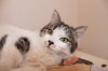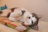 Мелисса приучена ко всем приспособлениям кошачьего быта - лоток знает на отлично, с когтеточкой дружит. Кушает натуральную еду и сухой корм.