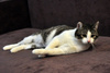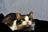 По характеру - беспроблемный. Любит побатониться на диване, помурчать, "бодает" руку и подставляется чтобы его гладили. Играет с махалочкой.