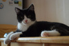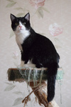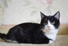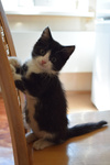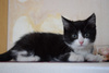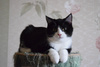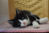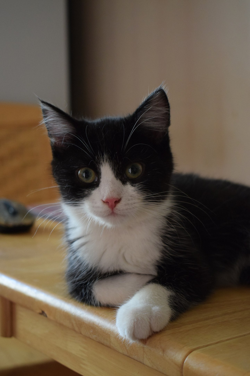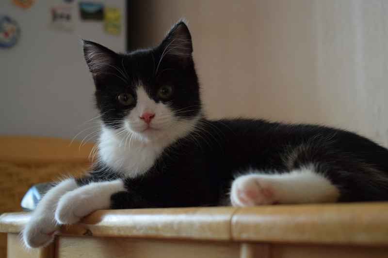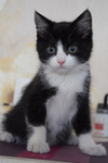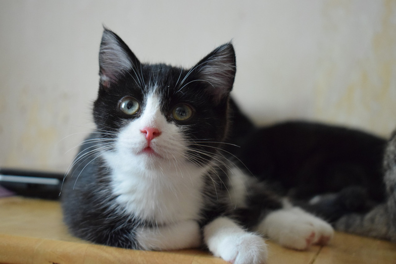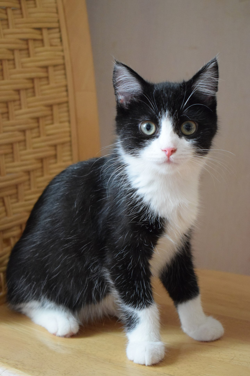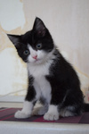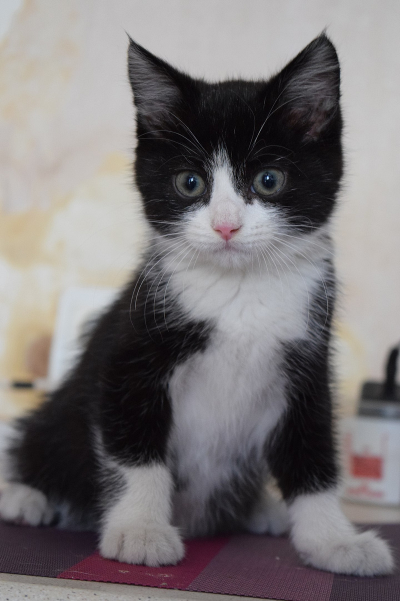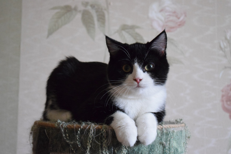 Возраст примерно 2,5 месяца. В поисках лучшей жизни Васятка пришел на обед к сотрудникам одного из офисов в промзоне, безошибочно определил ту, которая неравнодушна к кошкам, и подергал ее за штанину. В остальном котенок оказался не менее умненьким и самостоятельным: в первый же день в квартире пошел в лоток, кушает влажный и сухой корм, уважает сосиски. Активный, шкодливый, бесстрашный. Не боится ни людей, ни котов. Ласковый и ручной, но без излишней навязчивости – умеет сам себя занять. Мурчит громко – вы оцените. Еще совсем малыш, Васятка имеет интересный окрас с эффектом "седины": черная шубка усыпана серебристыми шерстинками. В игре использует коготки и зубы, поэтому в семью с маленькими детьми не подойдет.