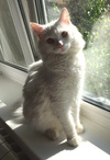Энергичный мальчик возраста около 1,5 года. Белый пушистый комочек радости с розовым носиком. Любит играть, но иногда слишком увлекается и сносит все на пути. Временами своенравен, временами ходит по пятам и заглядывает в глаза. Любопытный мальчик, не оставит ни одного угла в вашем доме не изученным. Кастрирован, к лотку приучен. В еде не привередлив, кушает все