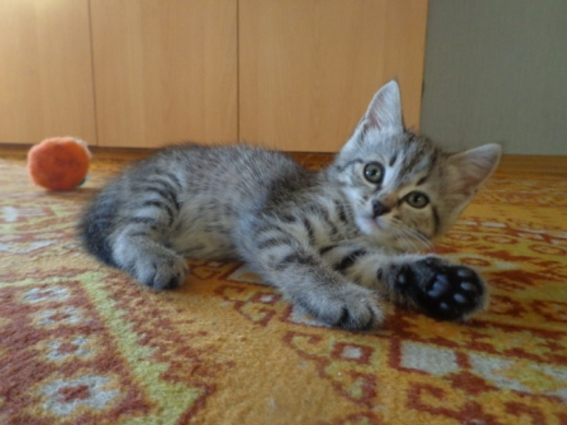 игривая нежность родилась 8 июня (месяц и три недели), кошечка. серенькая спинки, лапки, хвостик полосатые, пузико пестрое, на мордочке буква М, пяточки и нос черные. очень ласковая, игручая, мурчалка. ест натуралку и влажный корм, лоток с решеткой (без наполнителя). сообразительная