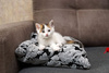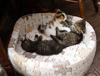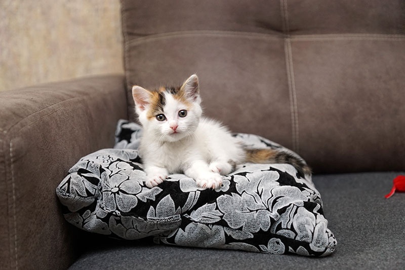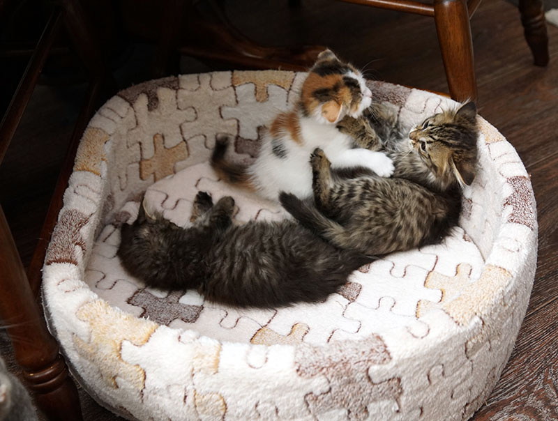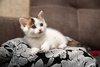 Совсем крошечная, трехцветная куколка, возраст приблизительно 1.5 мес, очень сообразительная, смелая, не из пугливых. Не теряется в новой обстановке,сразу нашла лоточек, миску с едой, стала знакомится с другими кошками.