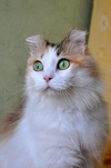 Принцесса - кошка невиданной красоты! Она обладает оригинальной внешностью, пикантными ушками (к сожалению, пострадавшими от мороза), богатой пушистой шубкой белого цвета с яркой рыже-коричнево-полосатой "накидочкой" на спинке) Ну и глазищи посмотрите какие! Большущие зелёные и всегда немножечко удивленные)) Характер под стать имени - кошечка знает себе цену, важничает, но с удовольствием идет на контакт с человеком.