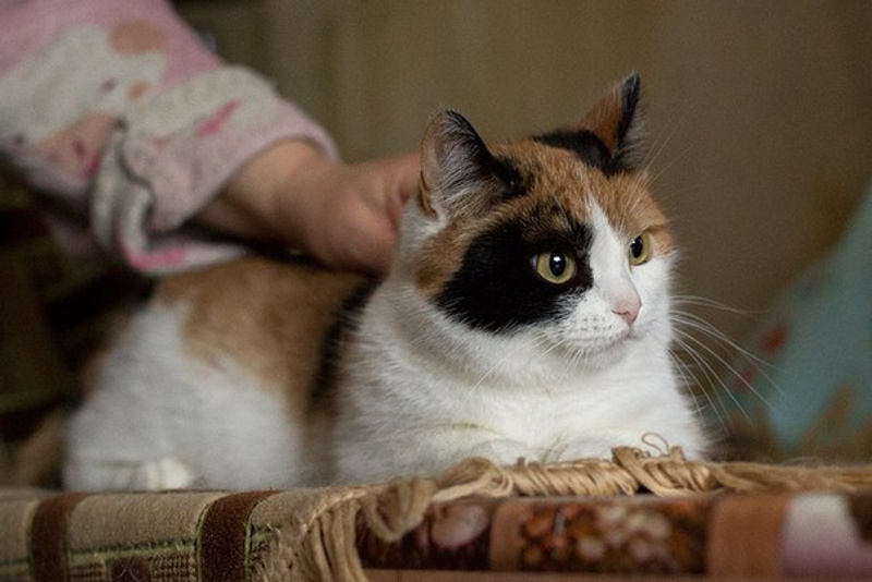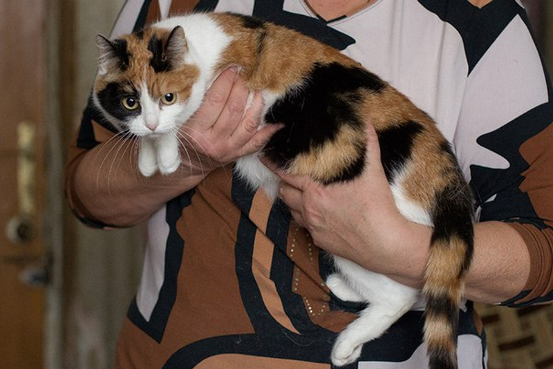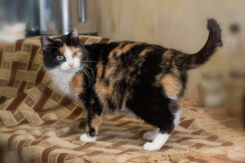 Классический пример трёхцветной кошки, приносящий в дом счастье. Посмотрите, какая она нарядная, мордастенькая, очаровательная!