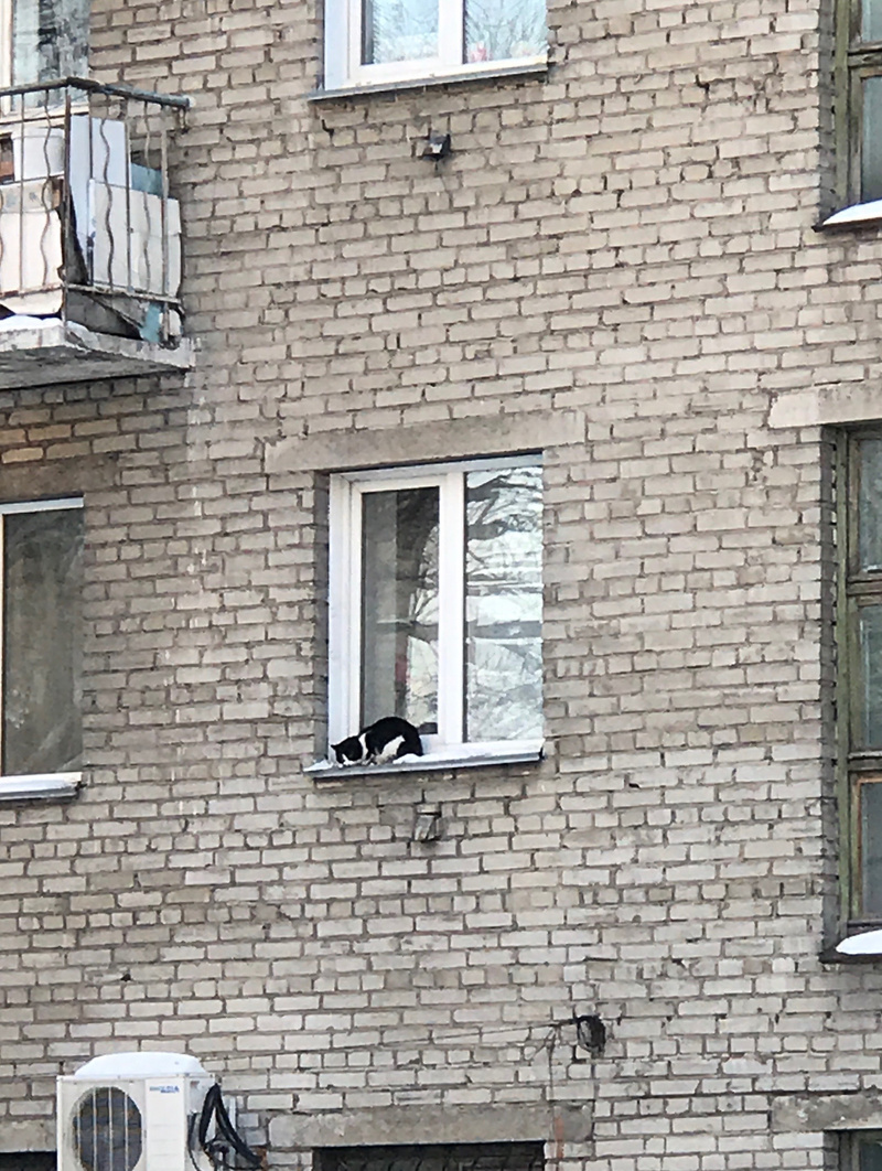 В воскресенье шли по улице и увидели жалобно мяукающего кота, сидящего на карнизе окна второго этажа. После неудачной попытки достучаться в квартиру к хозяевам решили кота снимать, пока не замёрз. Спасатели, ЖЭУ, служба помощи домашним животным помочь отказались. Вызвали автовышку, кота сняли, согрели, накормили.