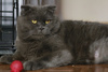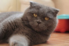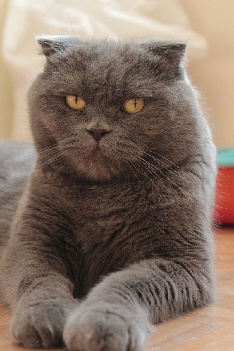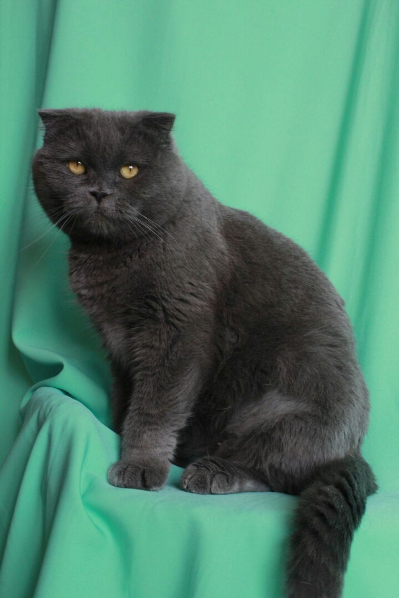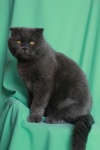 Похожа на британскую с висячими ушками. Окрас "голубой".