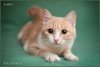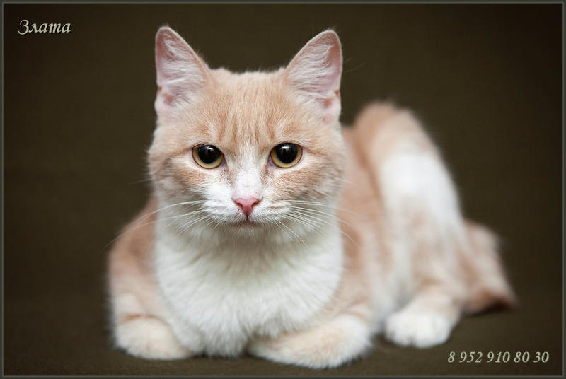 Имеет красивый персиковый окрас под мрамор, медового цвета глаза и укороченный хвостик от природы. Златочке около полутора лет, она отлично ладит со своими кошачьими сородичами