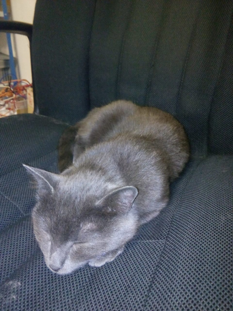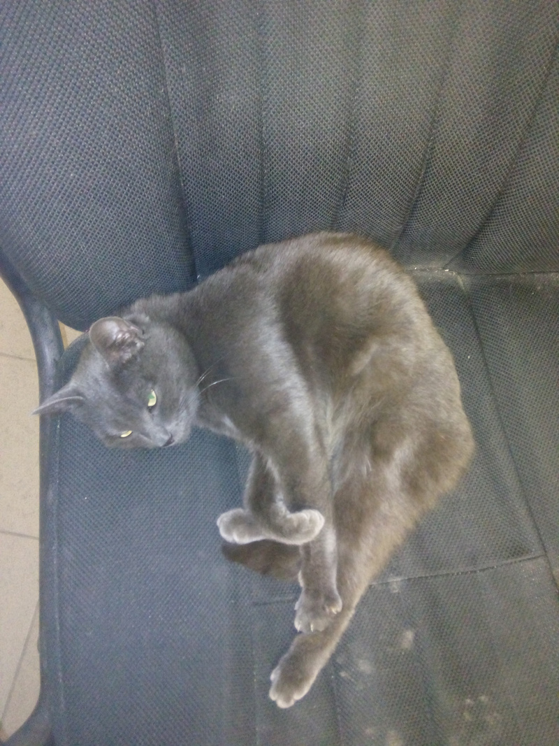 На работу приблудилась молодая кошка, окрас "под русскую голубую". На работе у меня ей совсем не место. Ласковая с людьми, но, как выяснилось, очень конфликтна с другими животными, эгоистка этакая. Лоток опознает уверенно. Ест все. Игривая, прыгучая.