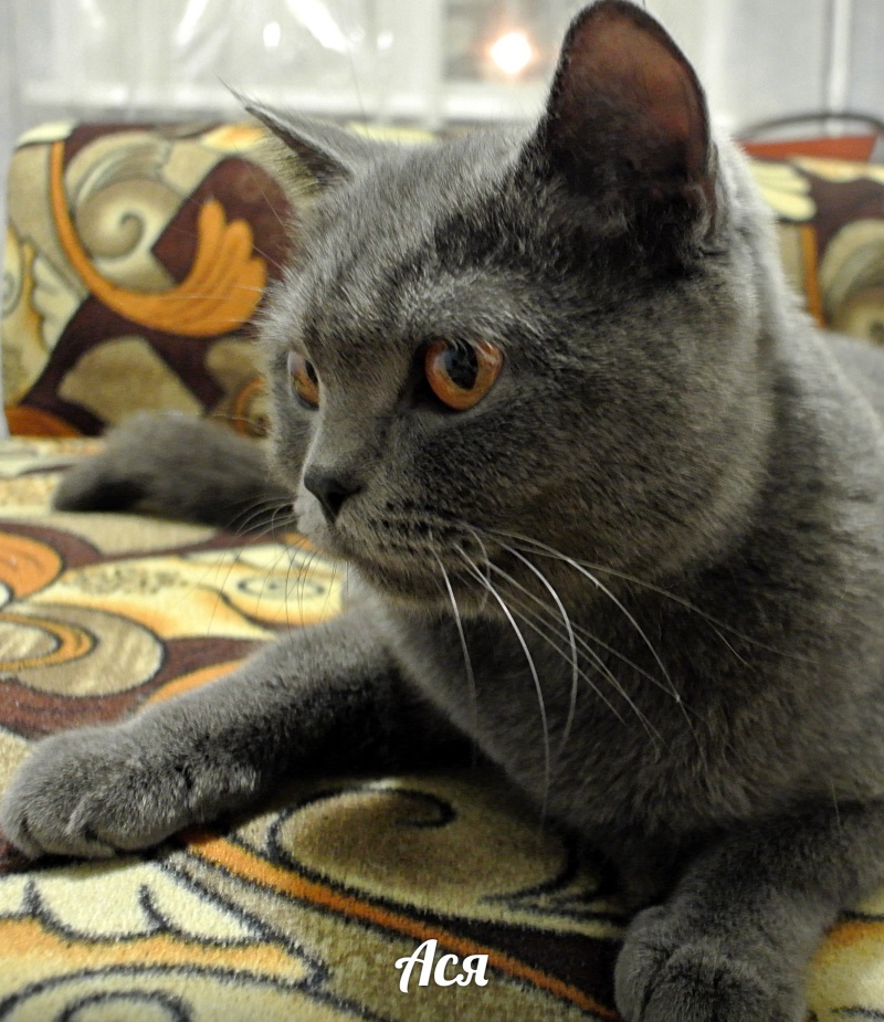 АСЯ – молодая кошка-британка 3-х лет, обладательница плюшевой шёрстки голубого окраса и выразительного взгляда. Как и полагается представительнице королевских кровей, она немного своенравна и любит сама решать, когда пришло время её погладить и поиграть. Тот, кто покорит её сердце, будет вознаграждён: Ася проявит своё внимание и потрётся об ноги, а ещё промурлычет что-нибудь на ушко
