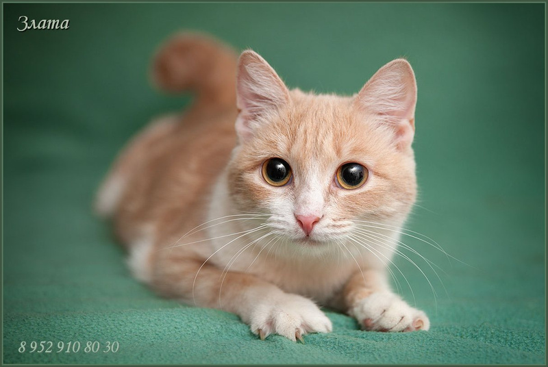Имеет красивый персиковый окрас под мрамор, медового цвета глаза и укороченный хвостик от природы. Златочке около полутора лет, она отлично ладит со своими кошачьими сородичами