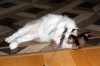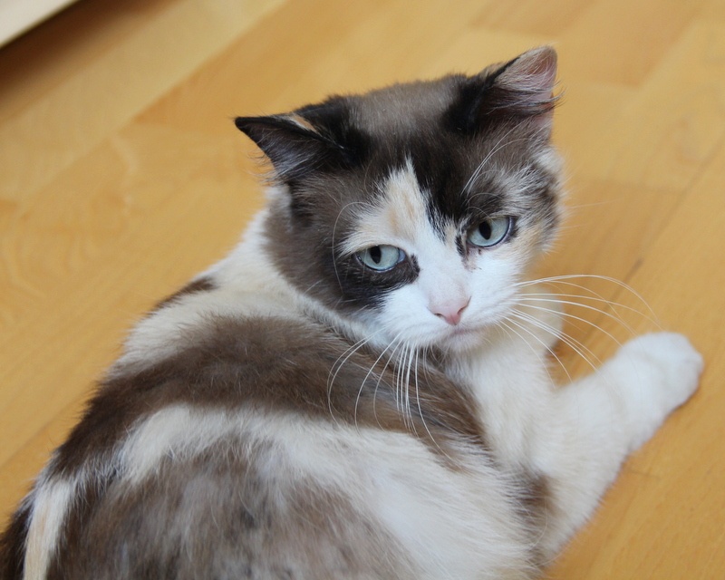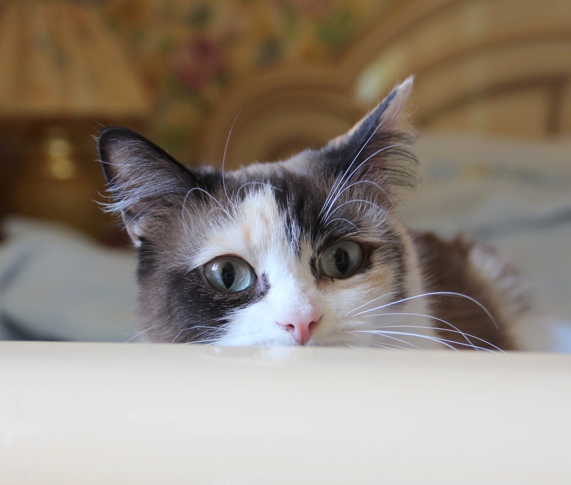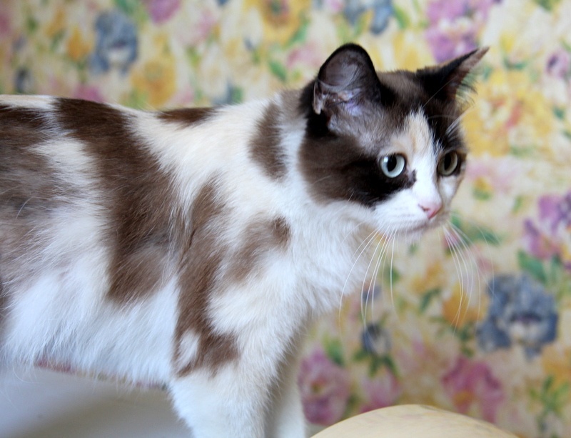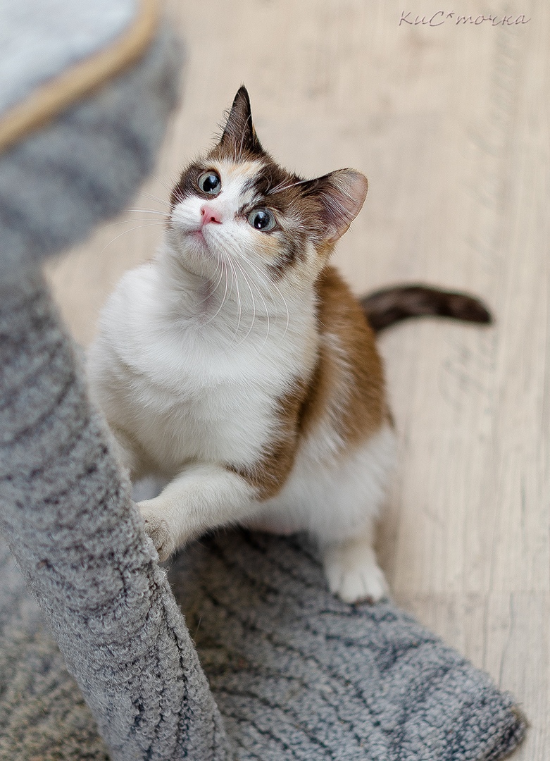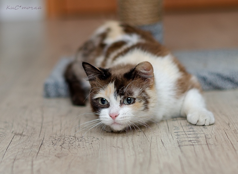Четырёхцветная голубоглазая шалунья. Всё бы ей играть да веселиться! На полочке стоит корзинка с игрушками для кошек. Тася это знает, постоянно проверяет корзинку, вдруг там появились новые игрушки. Их нужно срочно достать и начать играть. Иначе для чего ж их туда положили?