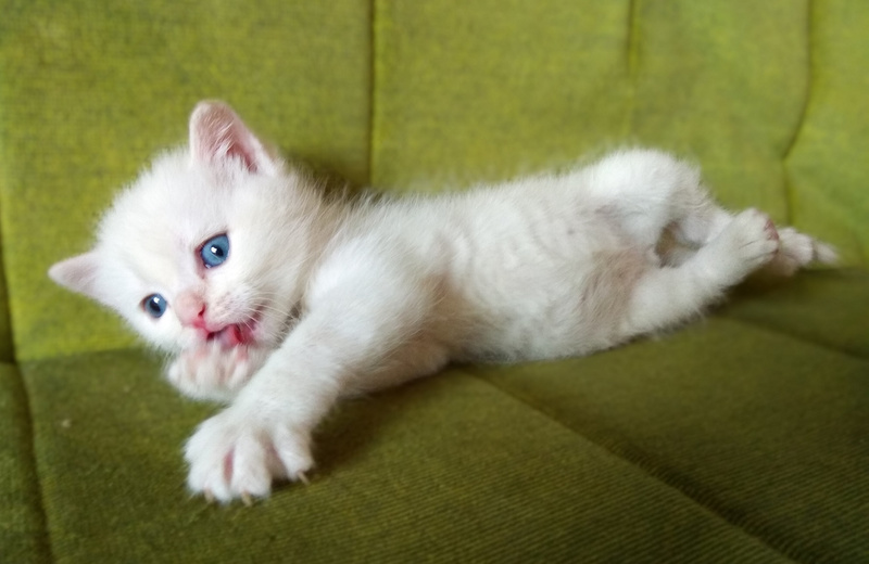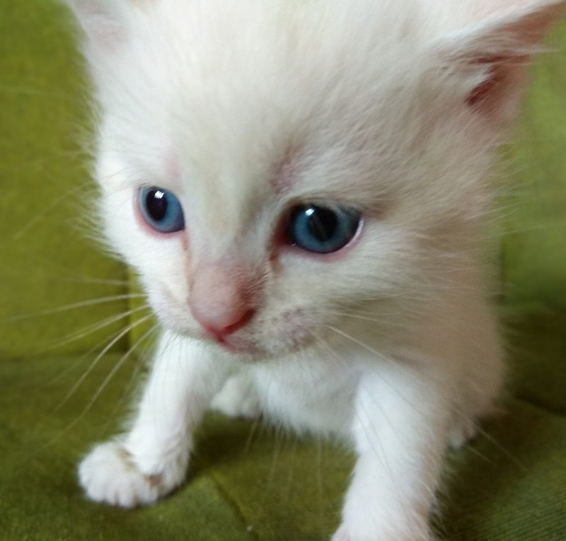 Метис невской маскарадной, котик-малыш (1 мес) с горькой судьбой ищет добрых хозяев. Он и 3 его сестрёнки в 3-дневном возрасте были заживо закопаны на территории садоводства хозяевами кошки-матери. Писк услышали ребятишки, нашли котят и откопали. В возрасте 3,5 недель котик охотно приучился к лотку, сейчас кушает из блюдечка молочко, кашку и мясное детское пюре. Родился совершенно белым, в настоящий момент хвостик, ушки, мордочка и немножко лапки начали постепенно окрашиваться в кремовый цвет. Глазки небесно-голубые, как и полагается котикам с окрасом колор-пойнт. Котик будет пушистым, очень игривый и забавный.