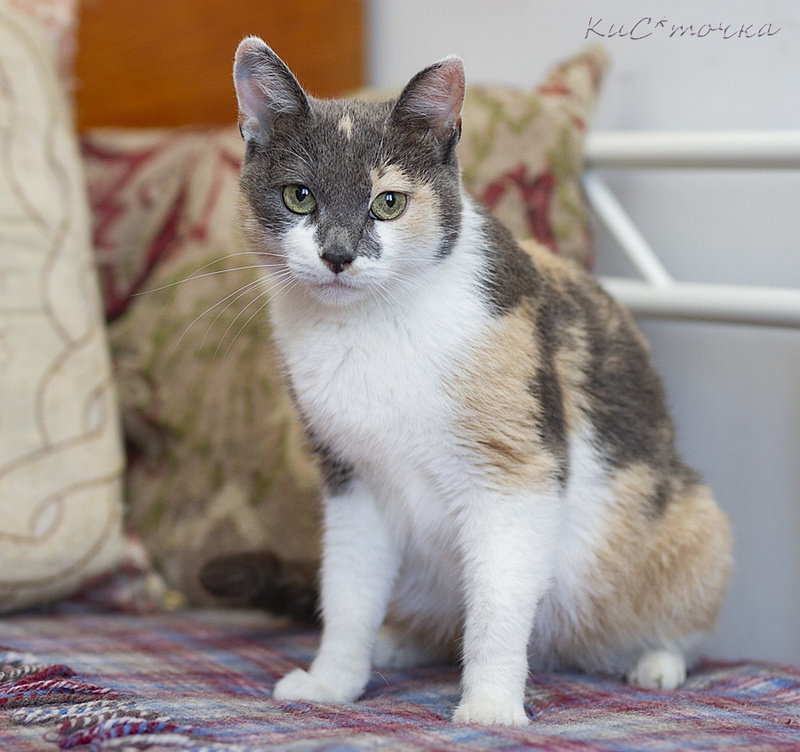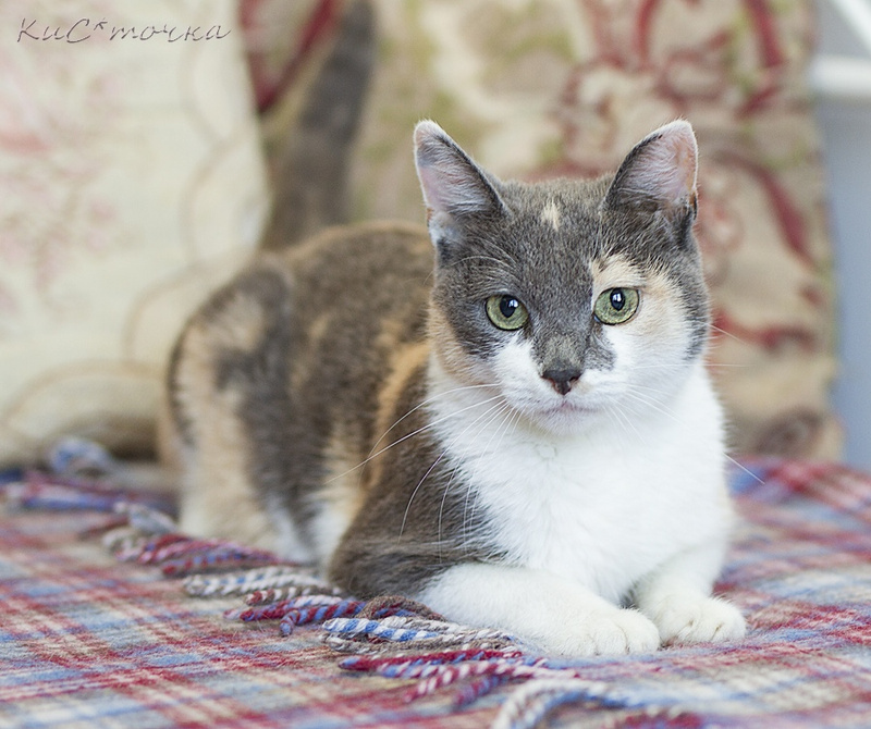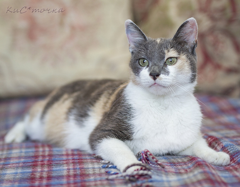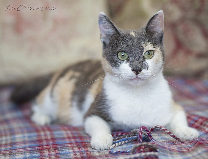 Кошечка скромная и спокойная. Но думаем, если она попадёт к хорошим людям, она раскроется, повеселеет, станет игривой, ведь ей всего 1 год. Она с радостью отвечает на ласку, тихонечко мурчит свои кошачьи песенки и очень верит в счастье. Трехцветные кошки не имеют права быть не счастливыми)