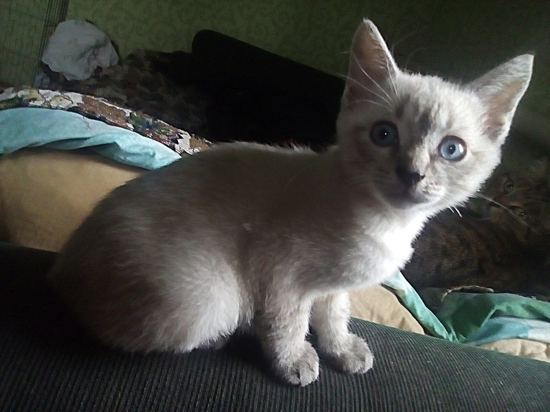 4-ый - кот, голубые глаза, белый окрас с серыми ушами и хвостом;