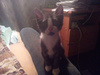 1-ый - кот, зелёные глаза, чёрный с белым животом и лапами;