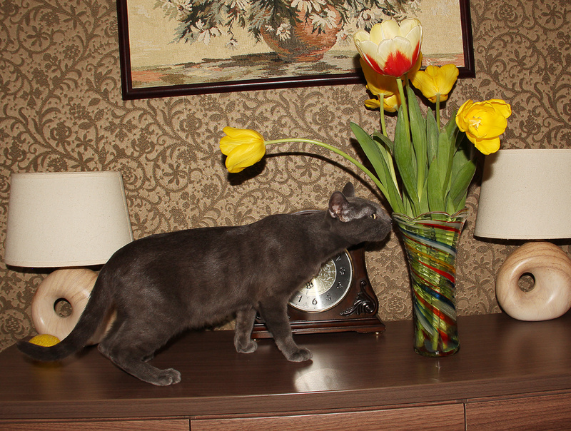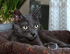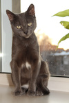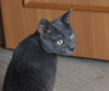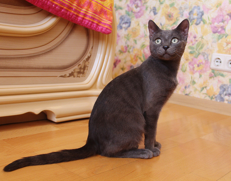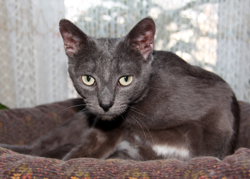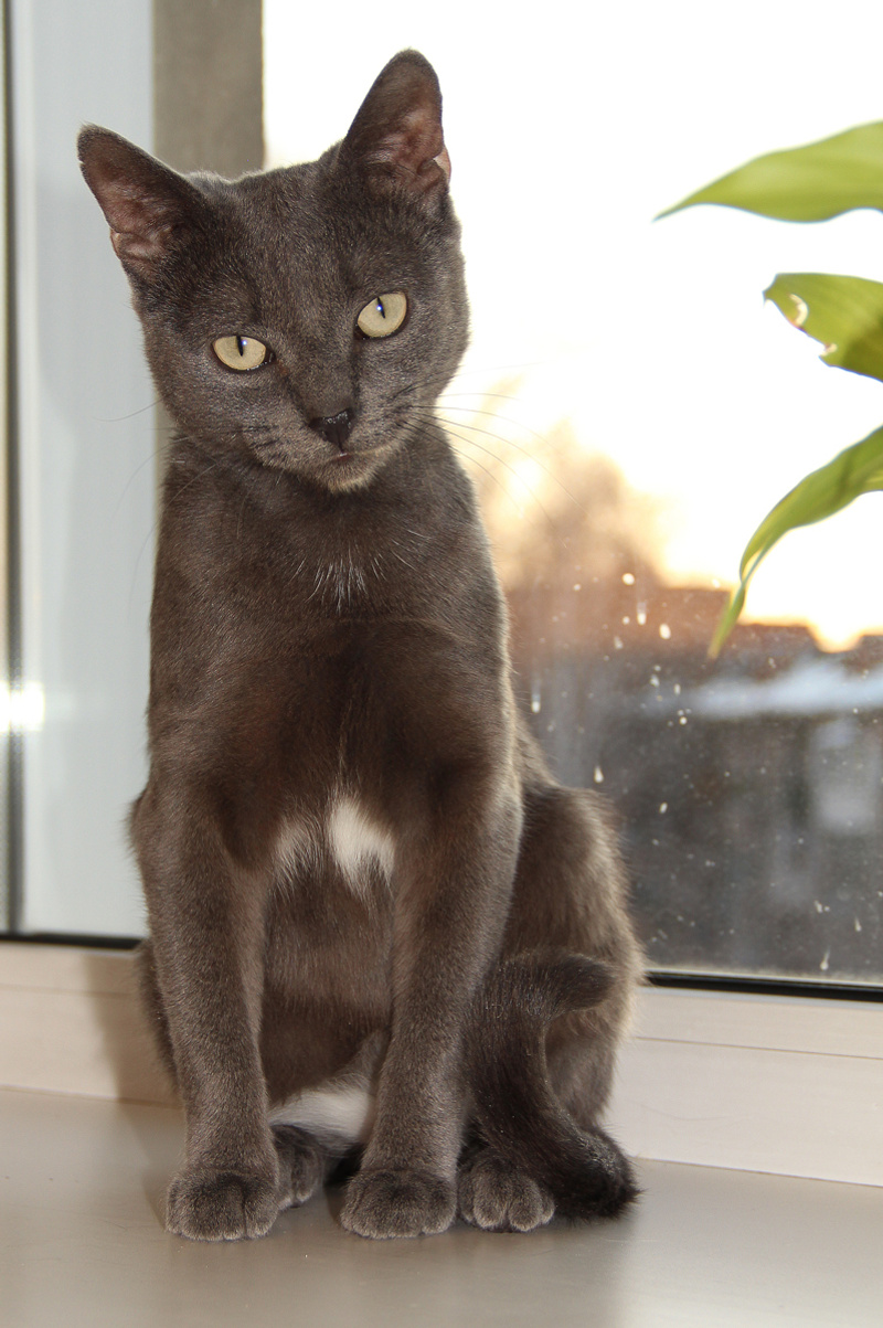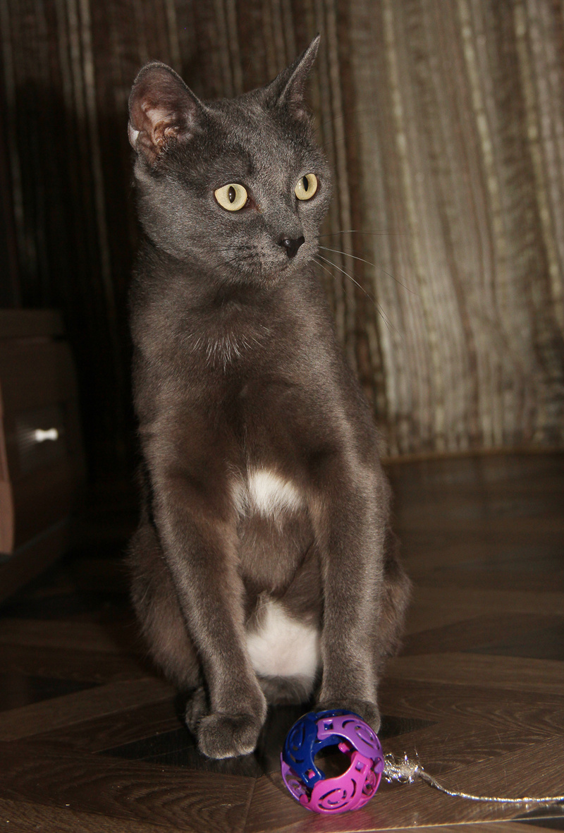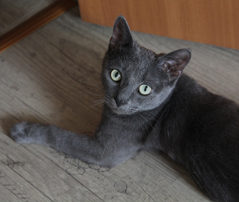 Котик очень изящный, маленький, даже миниатюрный. Шубка у него красивого дымчатого цвета, зелёные, умные глазки.