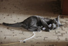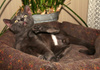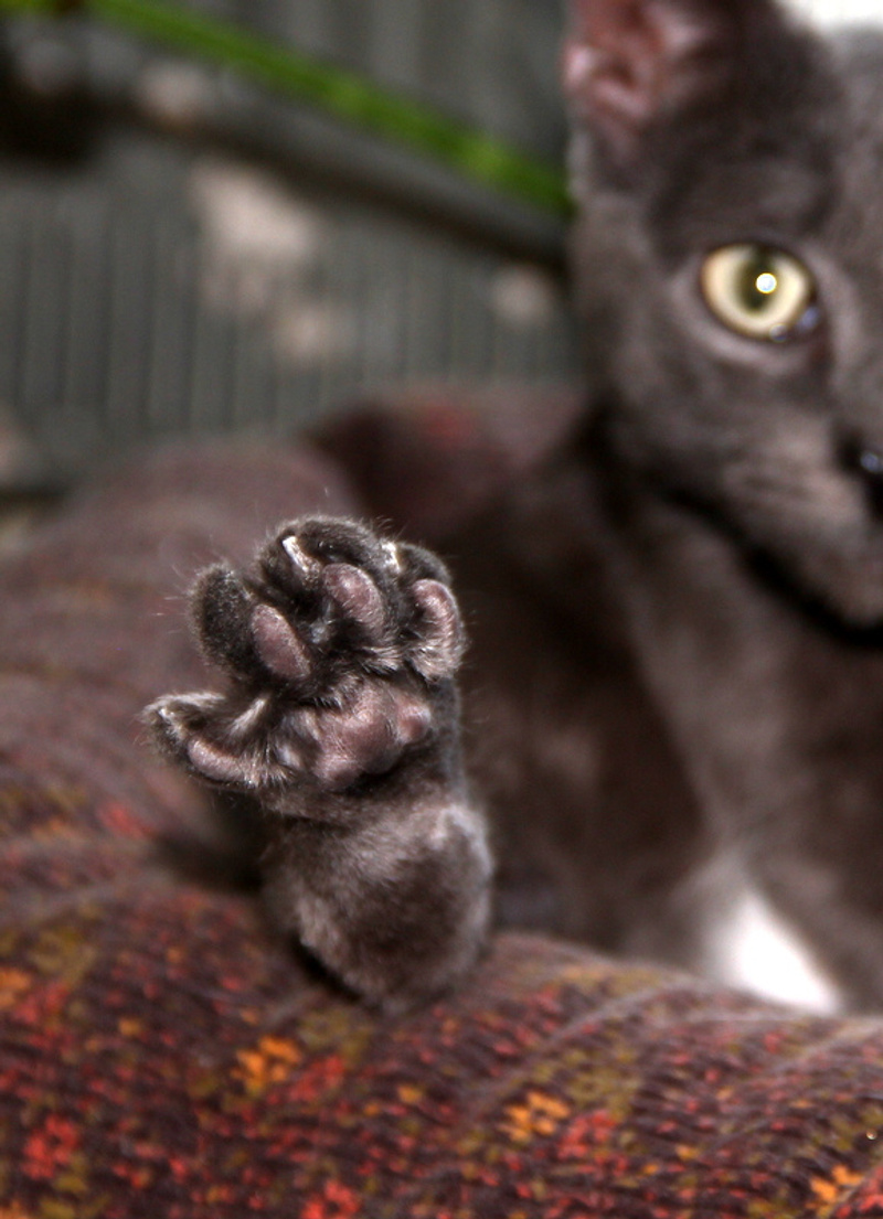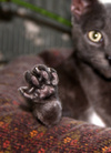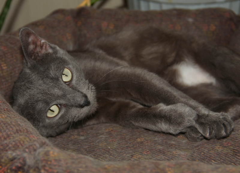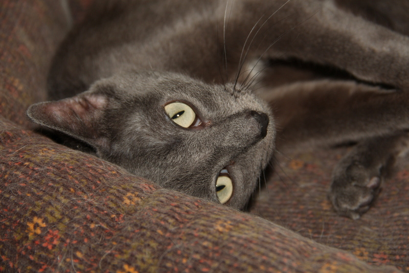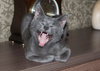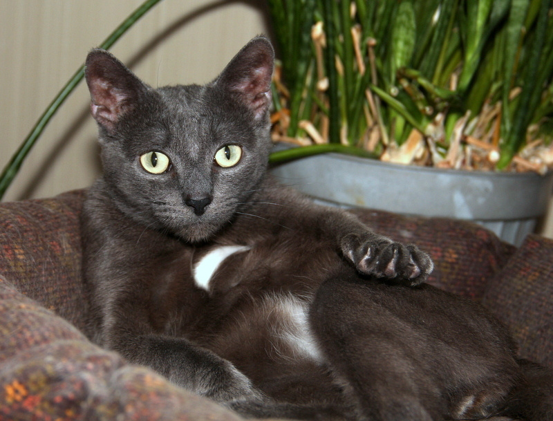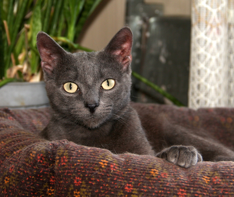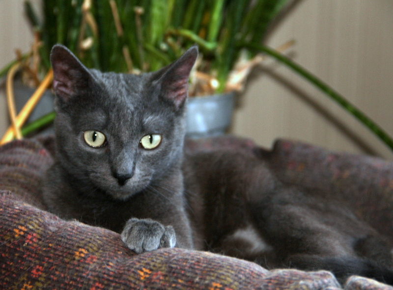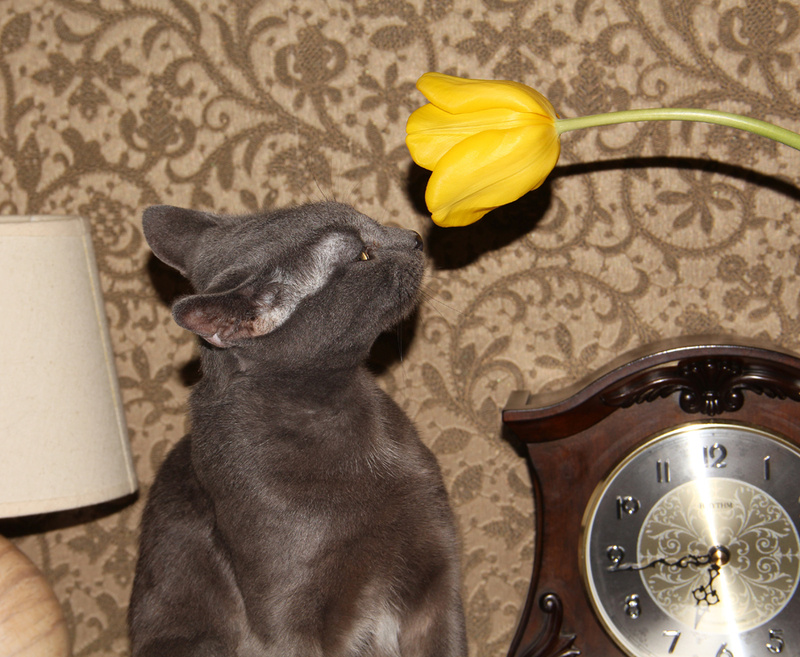 Котик очень изящный, маленький, даже миниатюрный. Шубка у него красивого дымчатого цвета, зелёные, умные глазки.