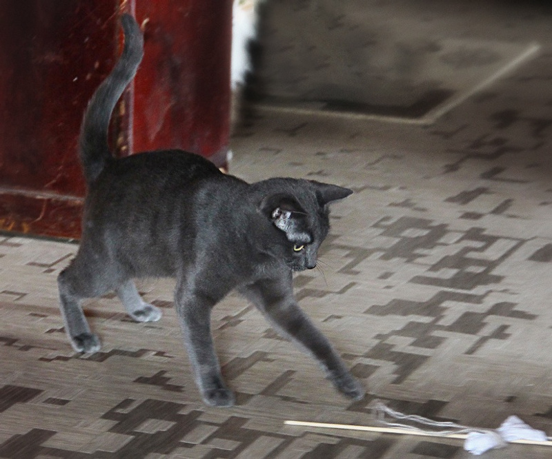 На передержке быстро подружился с другими кошками, стал играть в догоняшки или в футбол с мячиков.
