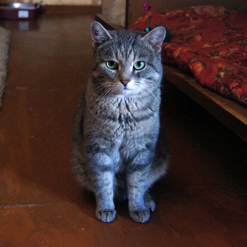 Сядет на стульчик, смотрит вам в глаза и ждёт, что вы ему скажете. Ласковый ооооочень, голову подставляет под руку: гладьте меня, пожалуйста! Мурчит.
