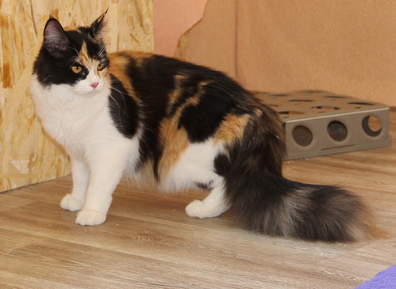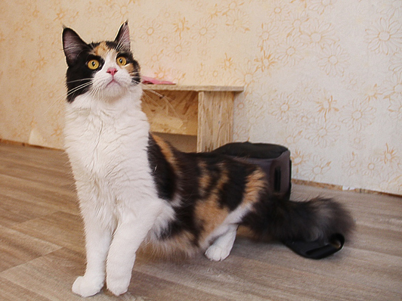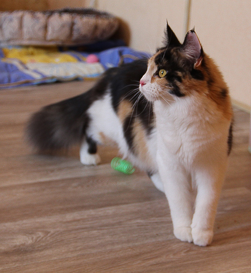 Кошка очень активная, не лишена охотничьих инстинктов, постоянно сидит на окне и ждёт, когда пролетит дичь, поэтому сетки на окнах-обязательное условие. Иначе улетит Майра за птичкой или мухой.